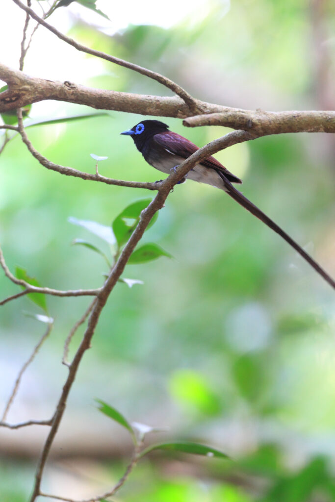 長い尾をなびかせるサンコウチョウは、まるで夢の世界から舞い降りたような神秘的な鳥。